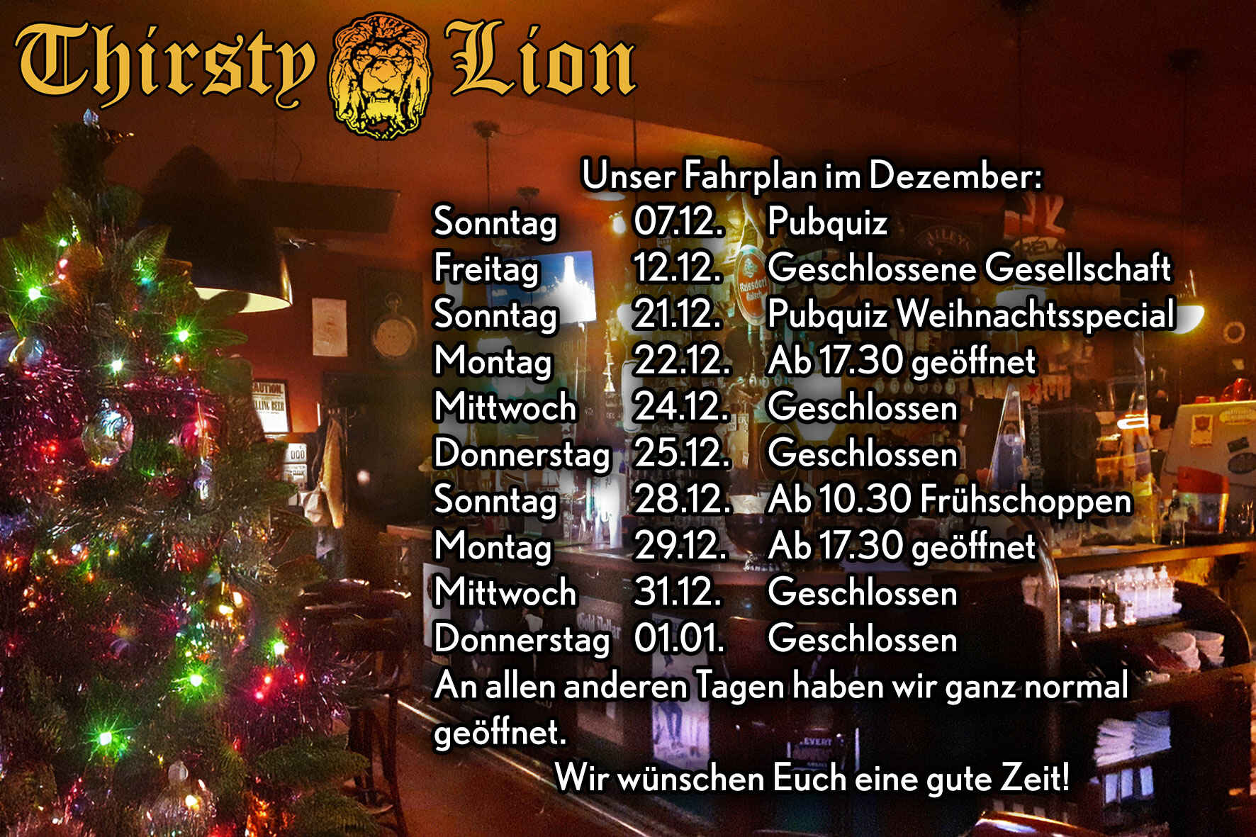 Unser Fahrplan im Dezember: Sonntag 07.12.: Pubquiz Freitag 12.12.: Geschlossene Gesellschaft Sonntag 21.12.: Pubquiz Weihnachtsspecial Montag 22.12.: Ab 17.30 geöffnet Mittwoch 24.12.: Geschlossen Donnerstag 25.12.: Geschlossen Sonntag 28.12.: Ab 10.30 Frühschoppen Montag 29.12.: Ab 17.30 geöffnet Mittwoch 31.12.: Geschlossen Donnerstag 01.01.: Geschlossen An allen anderen Tagen haben wir ganz normal geöffnet. Wir wünschen Euch eine gute Zeit! Wed, 03. Dec 2025