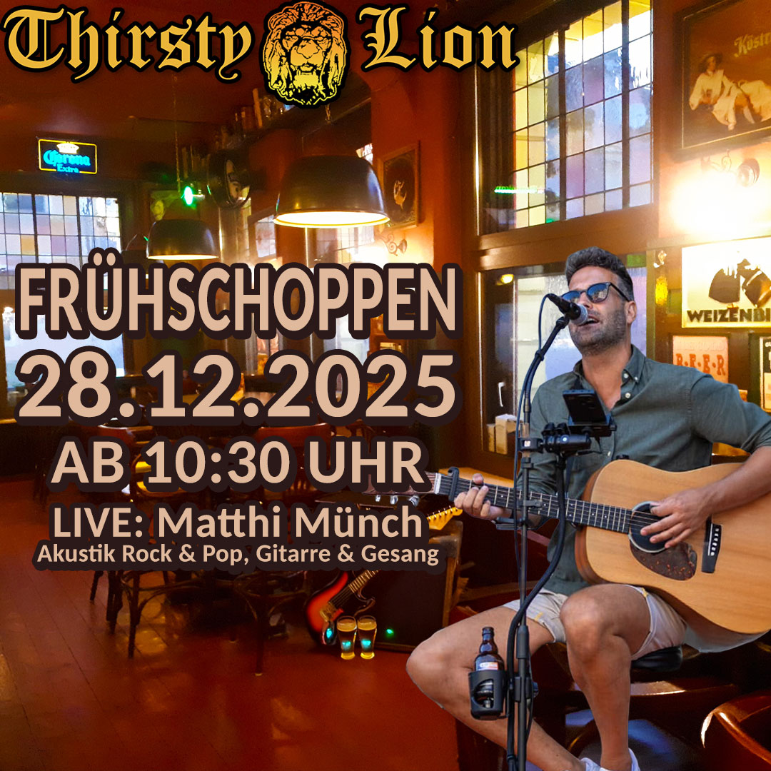 Genieße ab 10.30 Uhr einen gemütlichen Sonntag Vormittag beim Frühschoppen im Thirsty Lion. Freu Dich auf akustik Rock und Pop mit Gitarre und Gesang von Matthias Münch bei einem kühlen Bier oder einem Glas Wein. Probiere dazu unsere leckeren Spezialitäten und entdecke die Vielfalt unserer Speisekarte. Tischreservierungen empfohlen, täglich ab 17.30 unter 02631 861 878. Wir freuen uns auf Dich! Wed, 03. Dec 2025 -